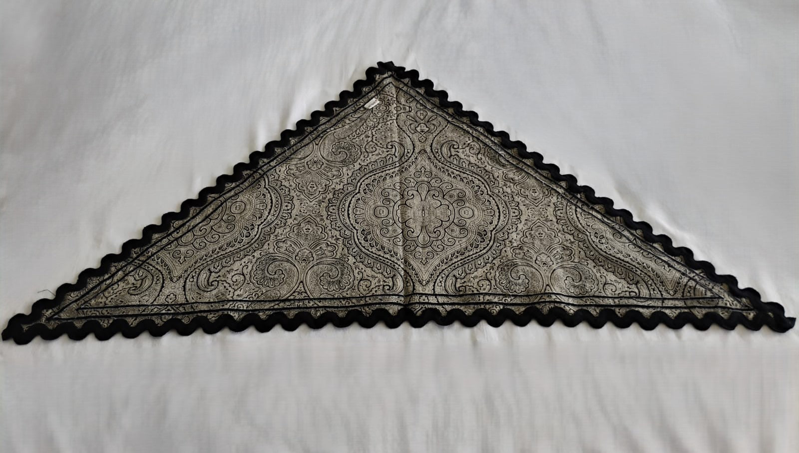 Details: Triangular floral scarf features two embroidered border lines - inner thin line and a thicker outer line - accented with ric-rac lace trim along the edges.