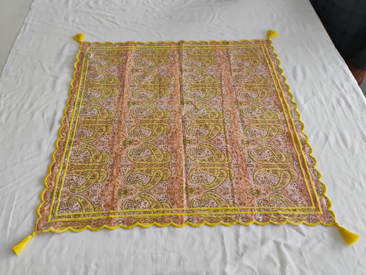 Details: A paisley print scarf with scalloped embroidered edges and two parallel lines of embroidery. Finished with four tassels at the corners, made from same matching thread.