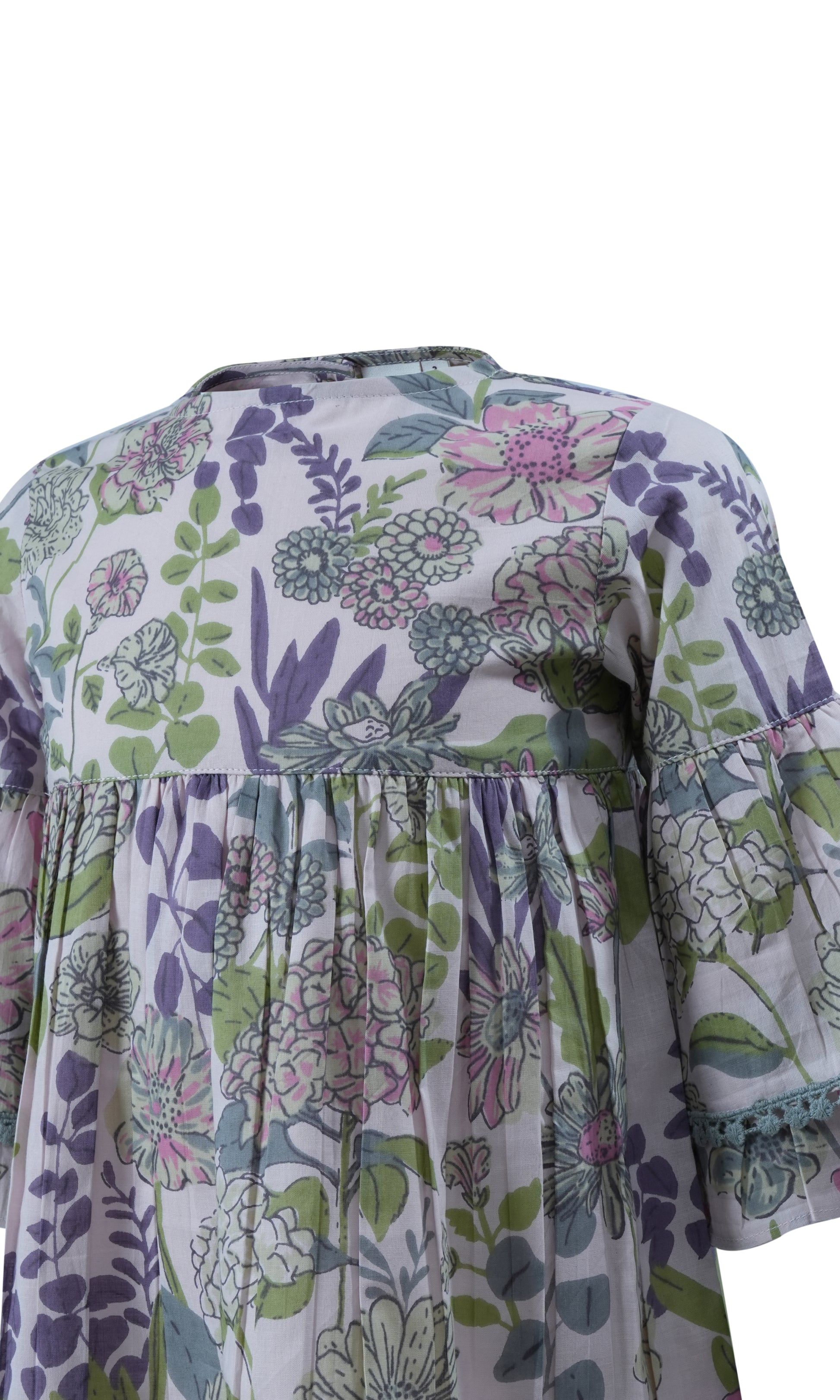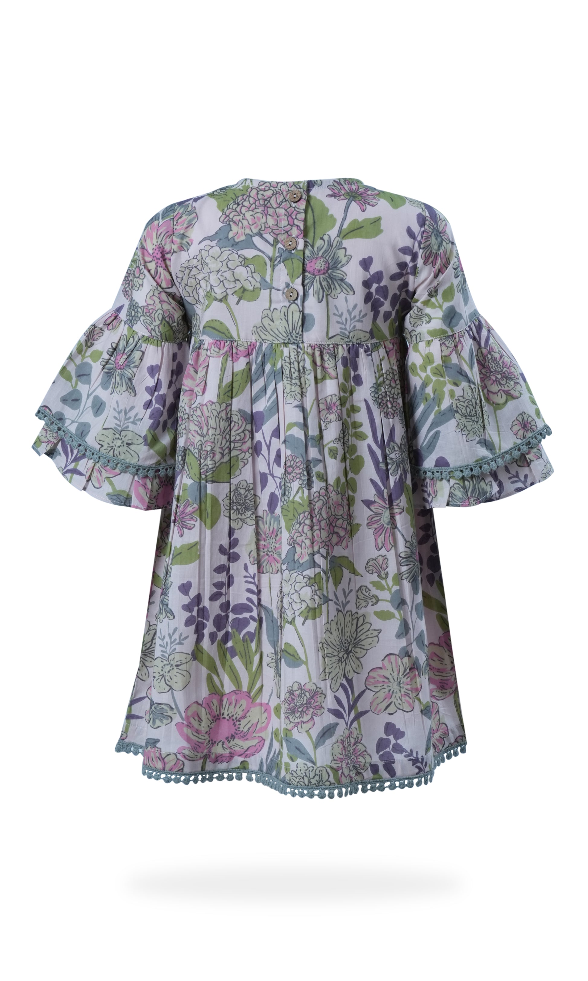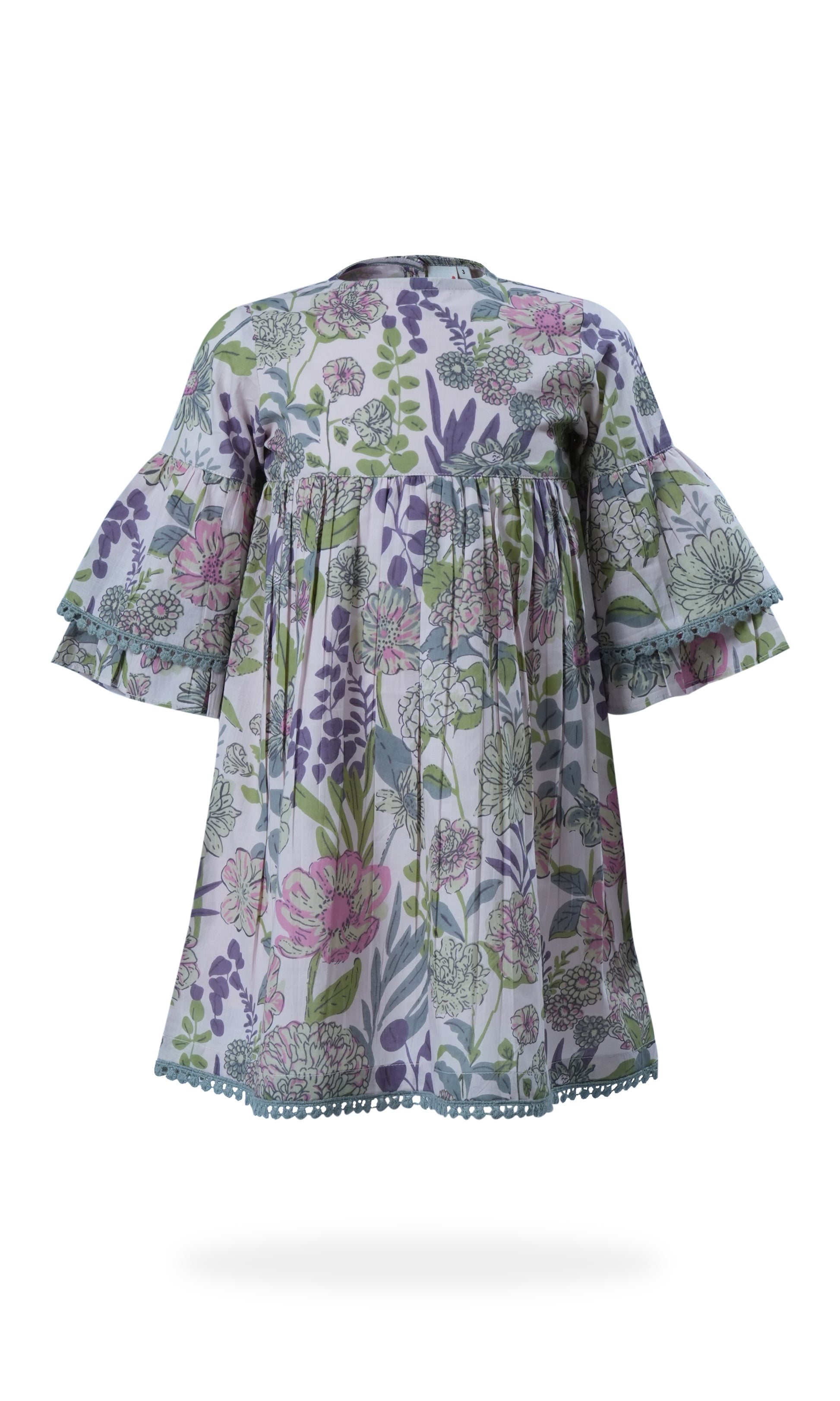 - Details: Bell sleeves with contrast fabric and delicate lace.