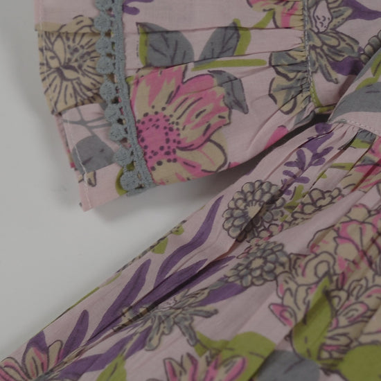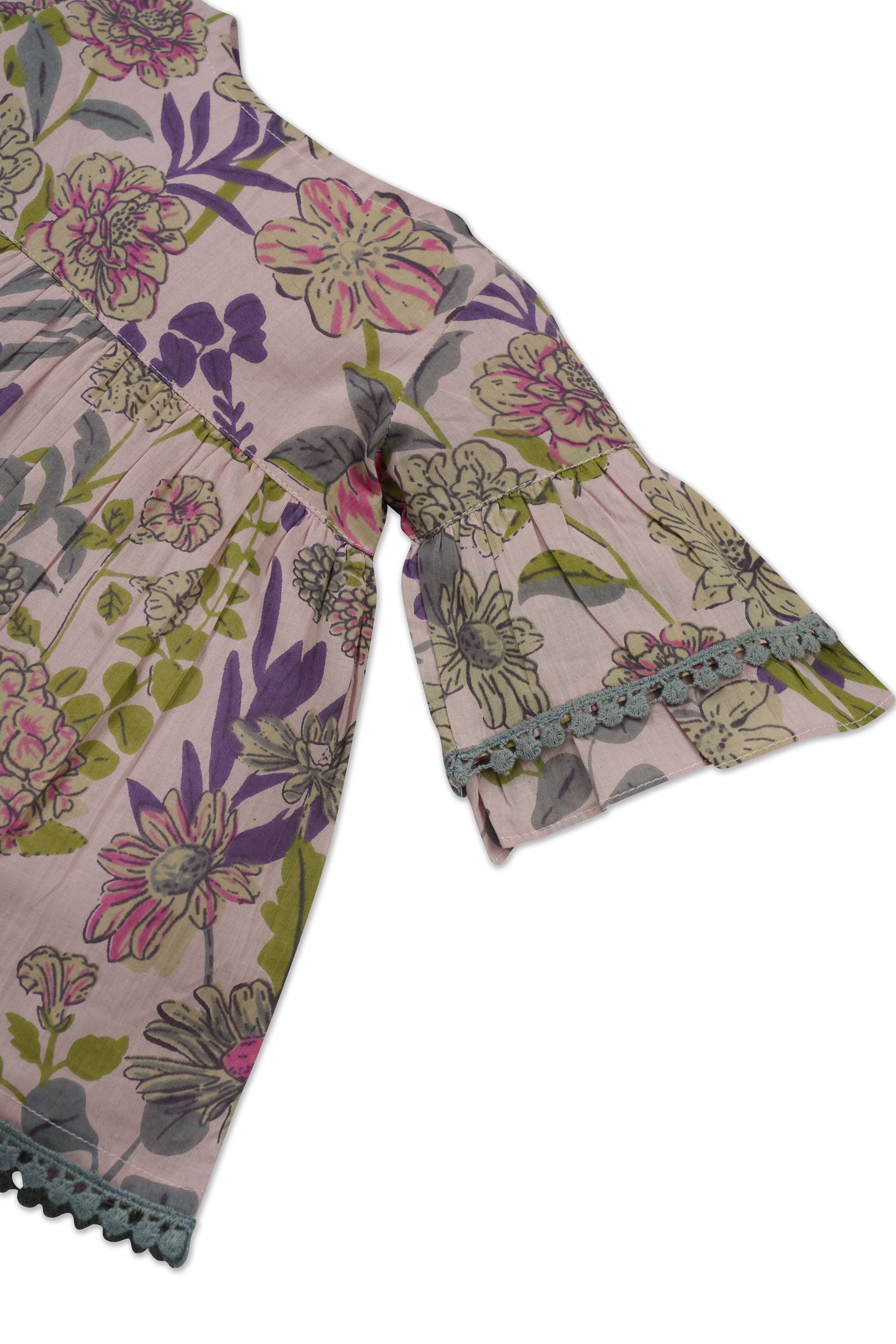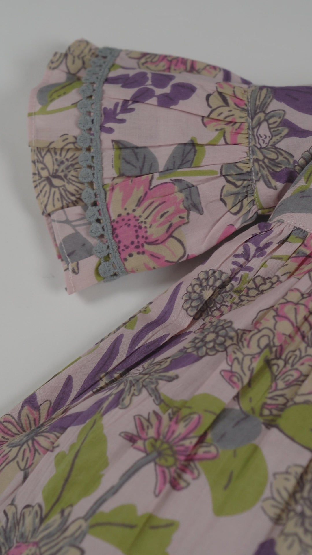 - Details: Bell sleeves with contrast fabric and delicate lace.