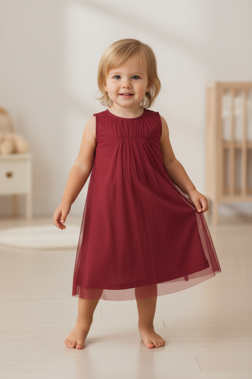 Dress your little one in this elegant Sleeveless Tulle Dress, perfect for both kids and infants. This beautiful dress features a soft tulle fabric with a stylish ruffle neck design. The gathered ruching detailing on the front adds extra charm while the soft cotton lining ensures comfort. The infant size comes with a matching cotton bloomer for a complete outfit. Great for Valentines Day!